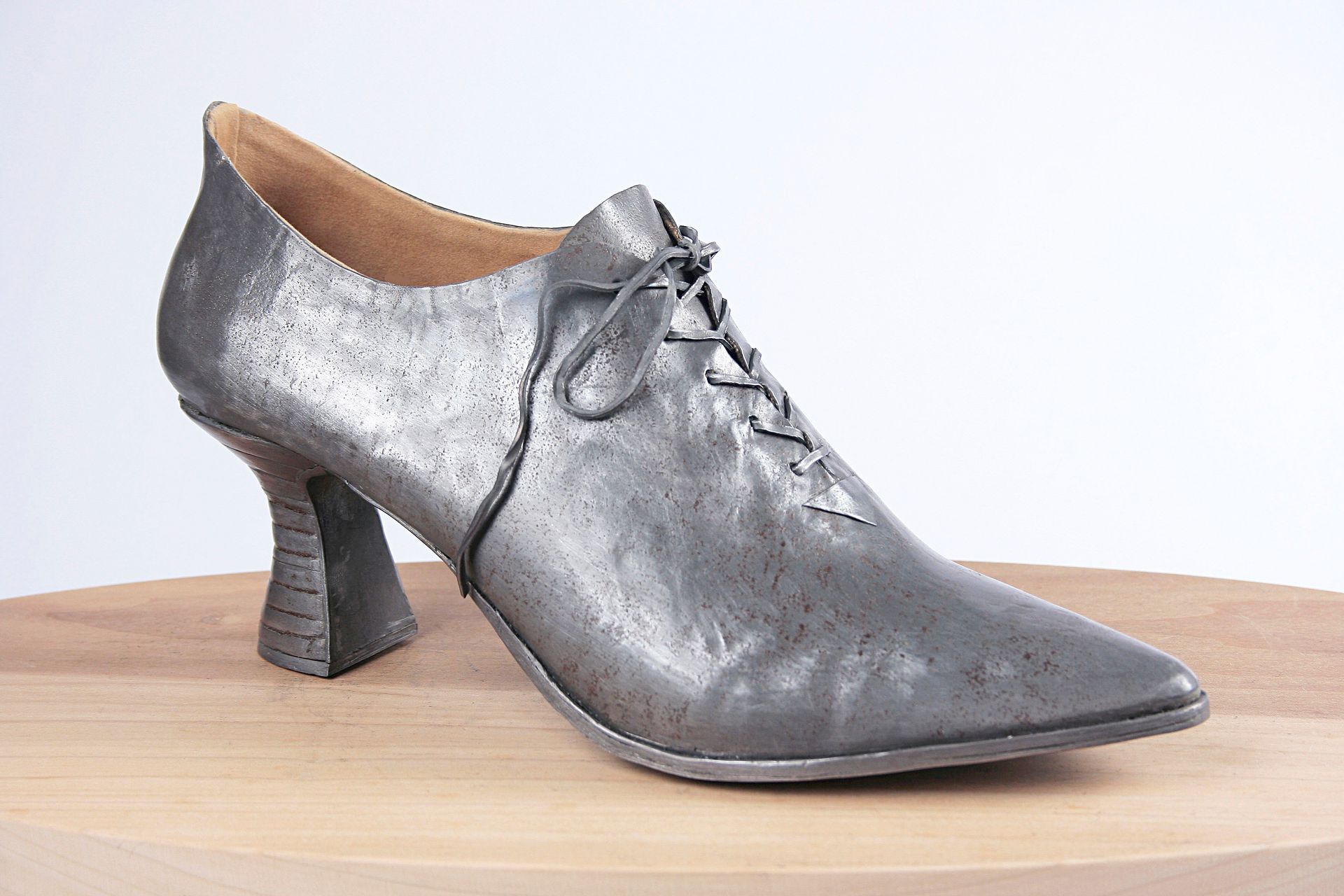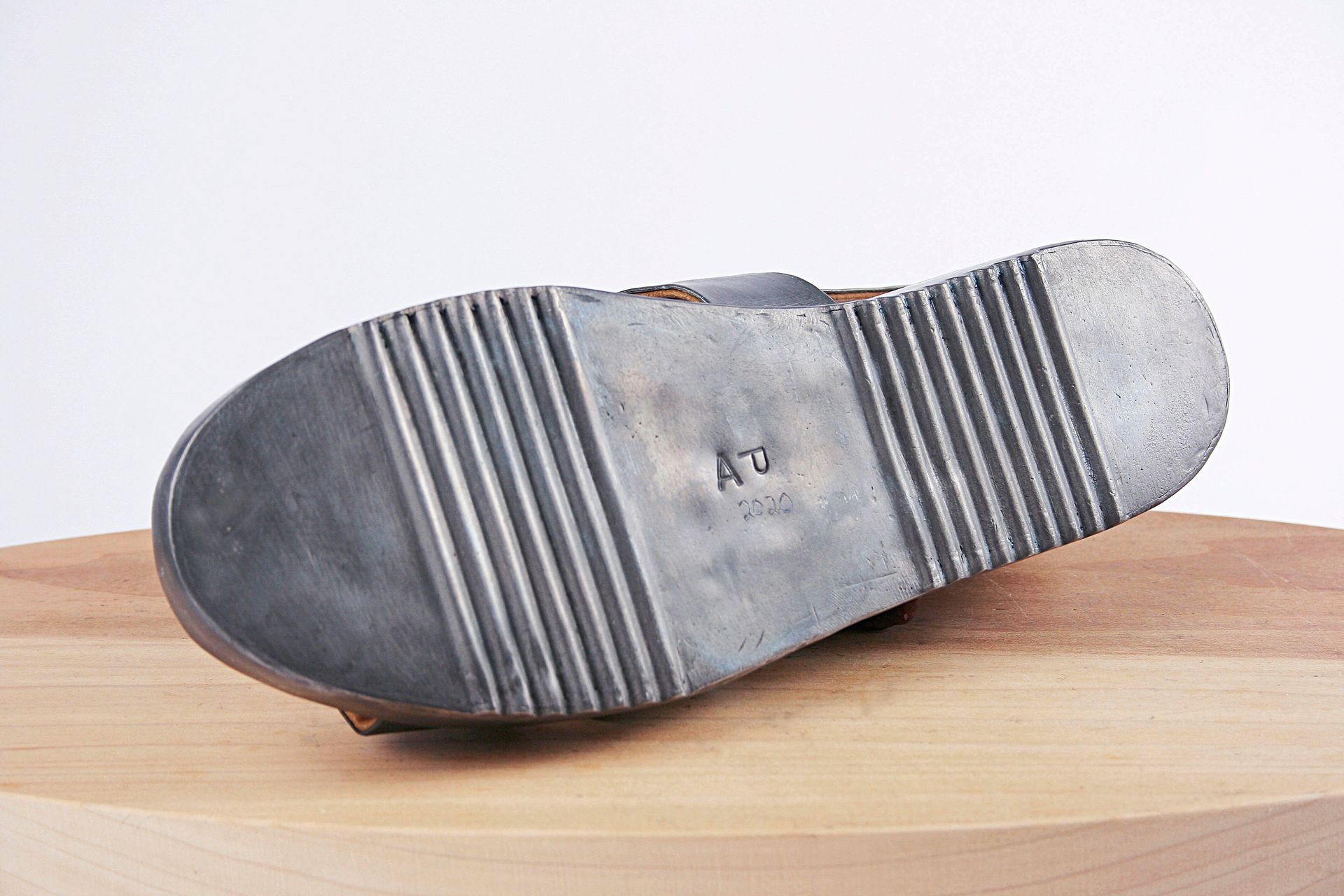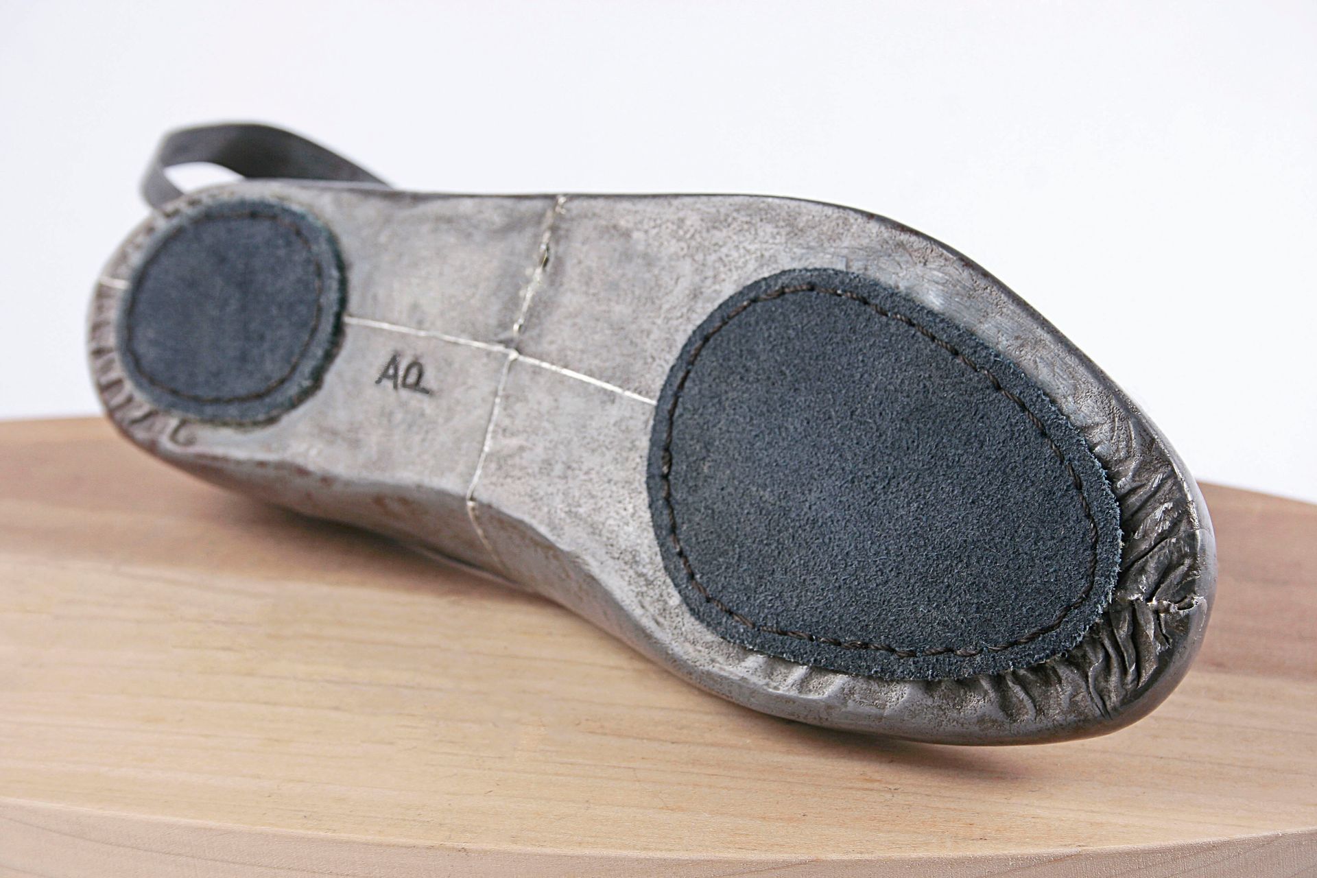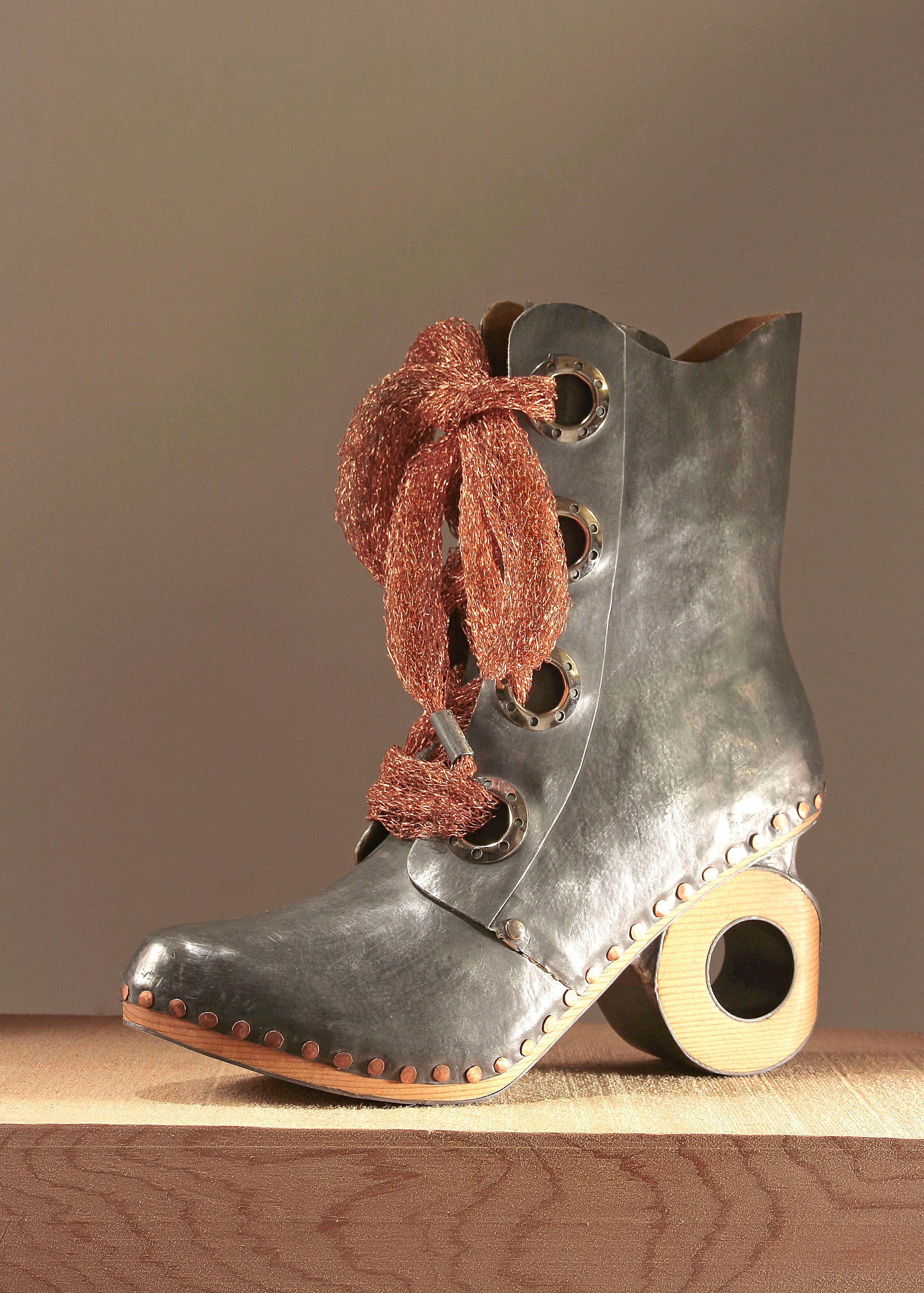 I work with lead for its malleability, its archetypal and psychological resonance, its danger, weight, beauty, its protective qualities, its recyclability, its permanence. These pieces are made using mostly traditional shoemaking techniques. Starting with a concept I create the last (form on which the shoe is made) from plaster, draft the upper pattern in paper, then cut and often sew the parts by hand. The soles are cut and shaped from lead and/or wood.