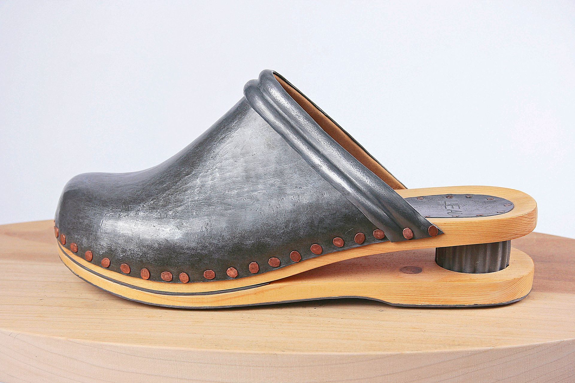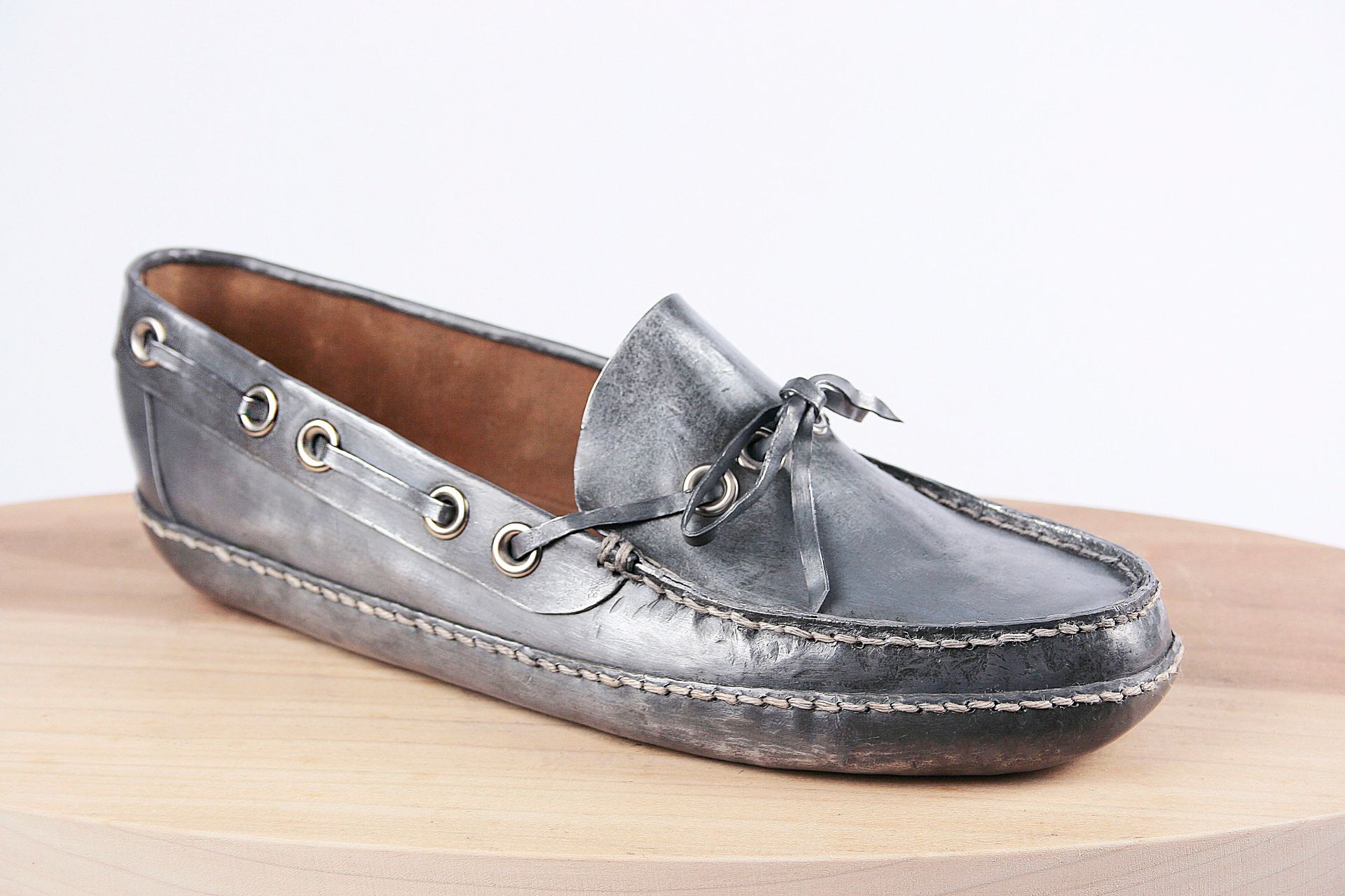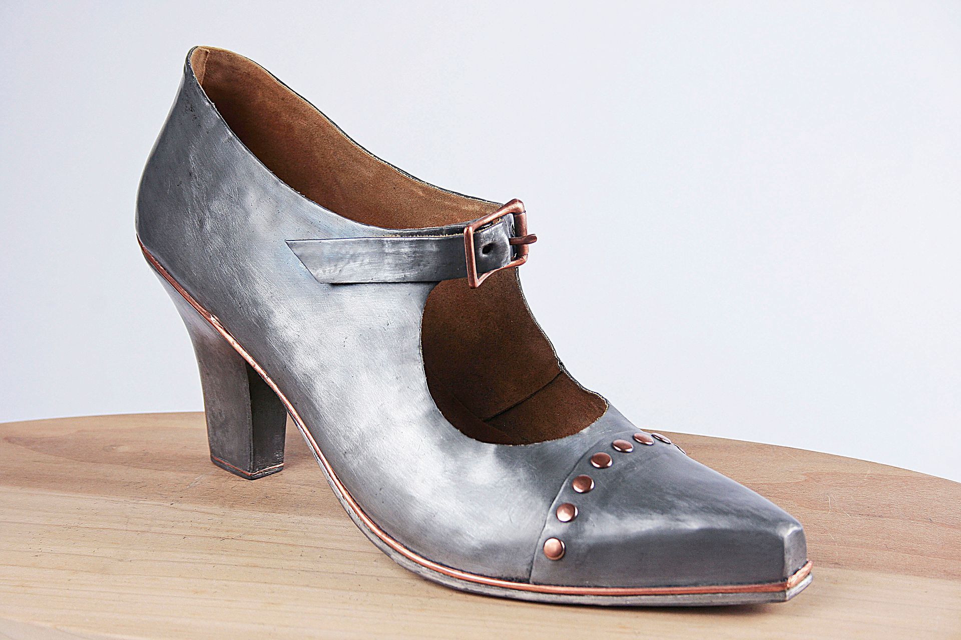 I work with lead for its malleability, its archetypal and psychological resonance, its danger, weight, beauty, its protective qualities, its recyclability, its permanence. These pieces are made using mostly traditional shoemaking techniques. Starting with a concept I create the last (form on which the shoe is made) from plaster, draft the upper pattern in paper, then cut and often sew the parts by hand. The soles are cut and shaped from lead and/or wood.