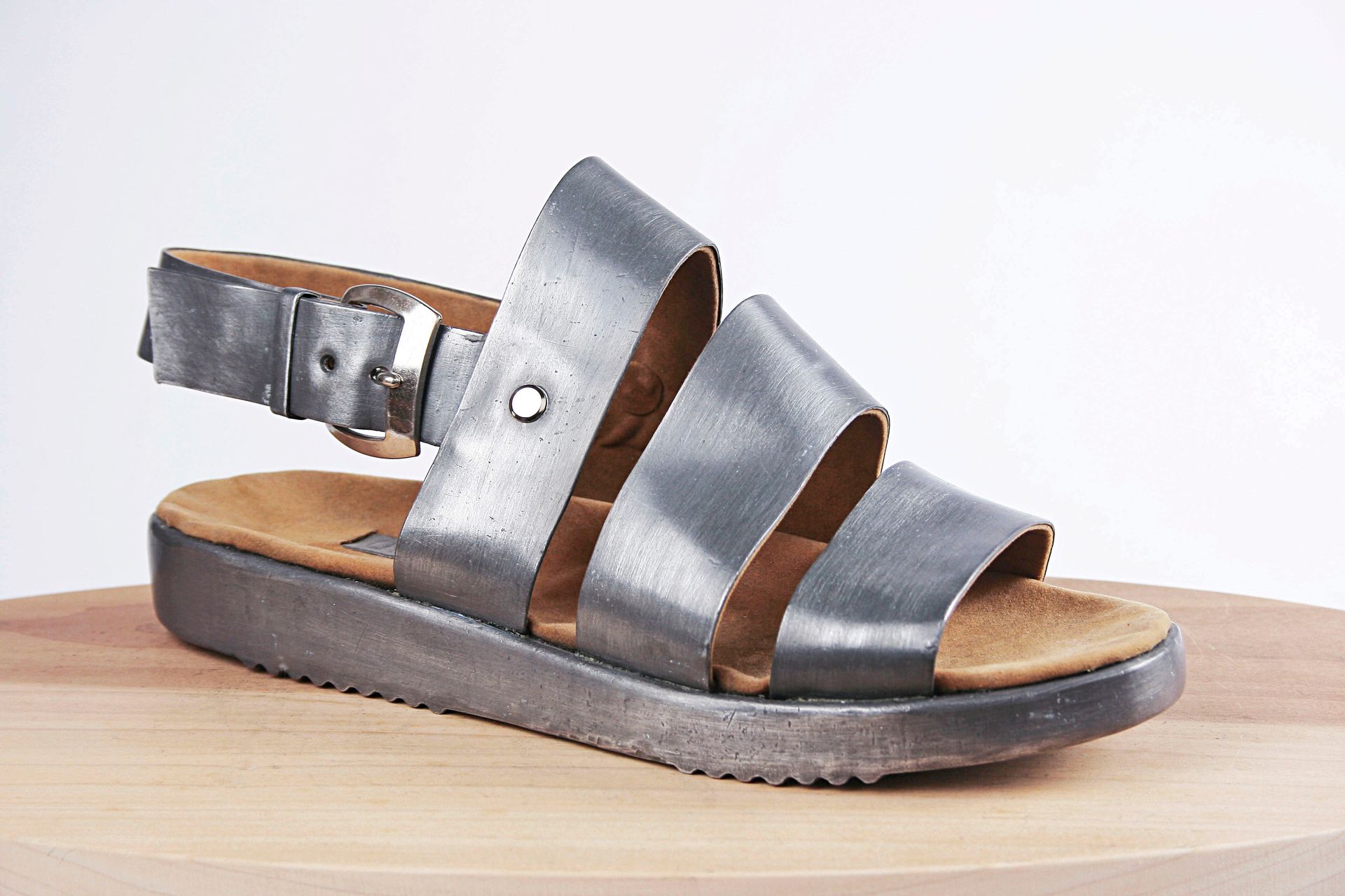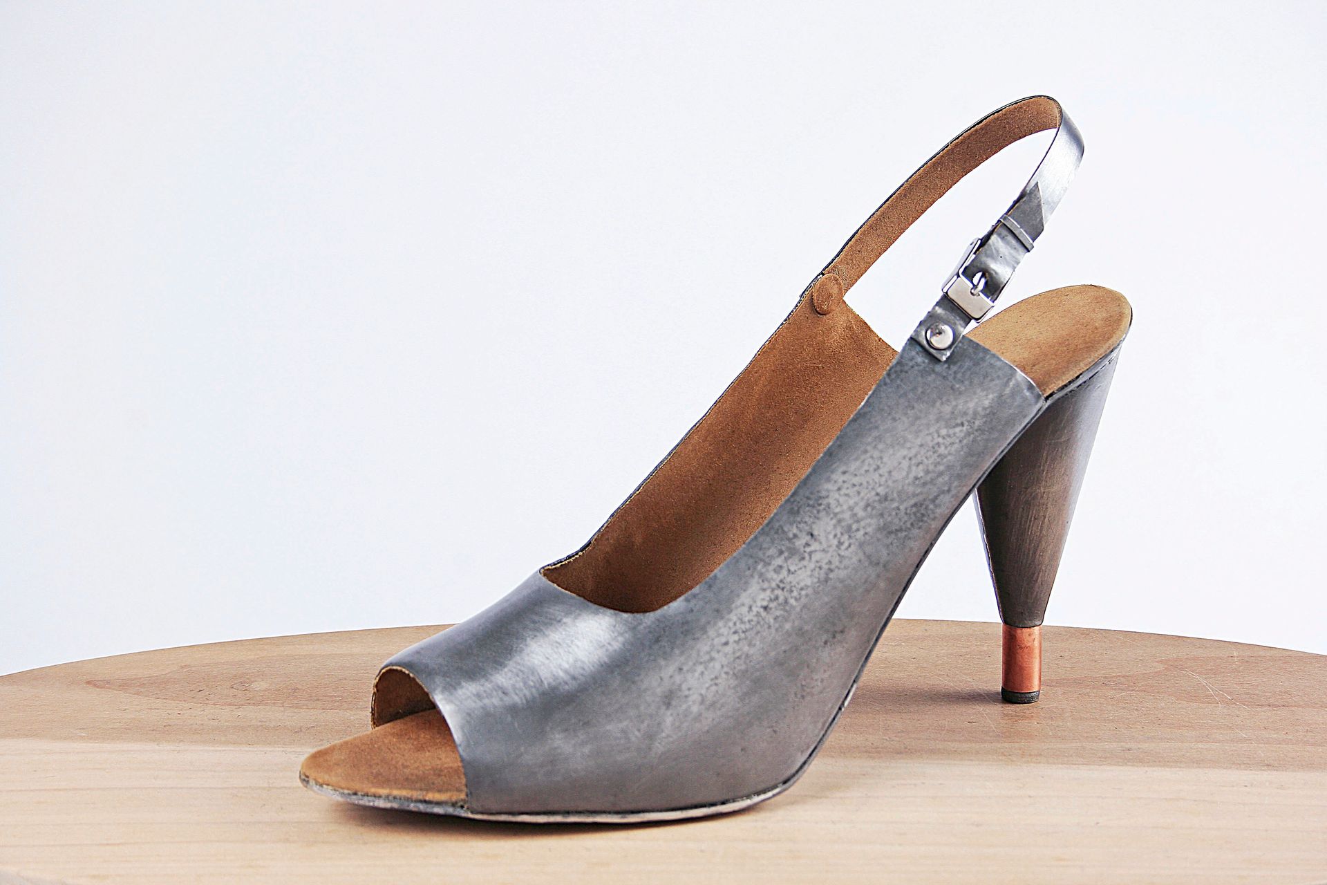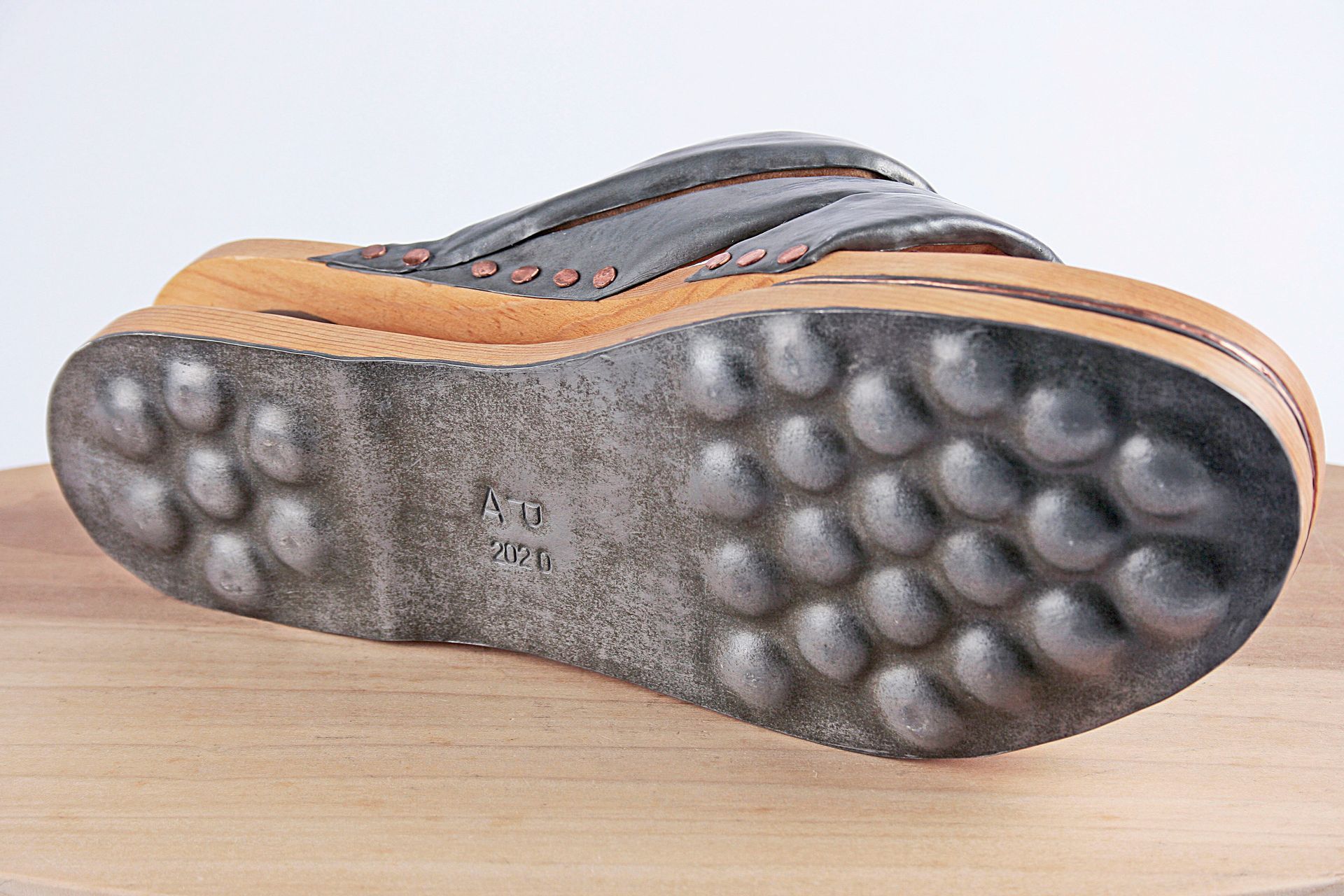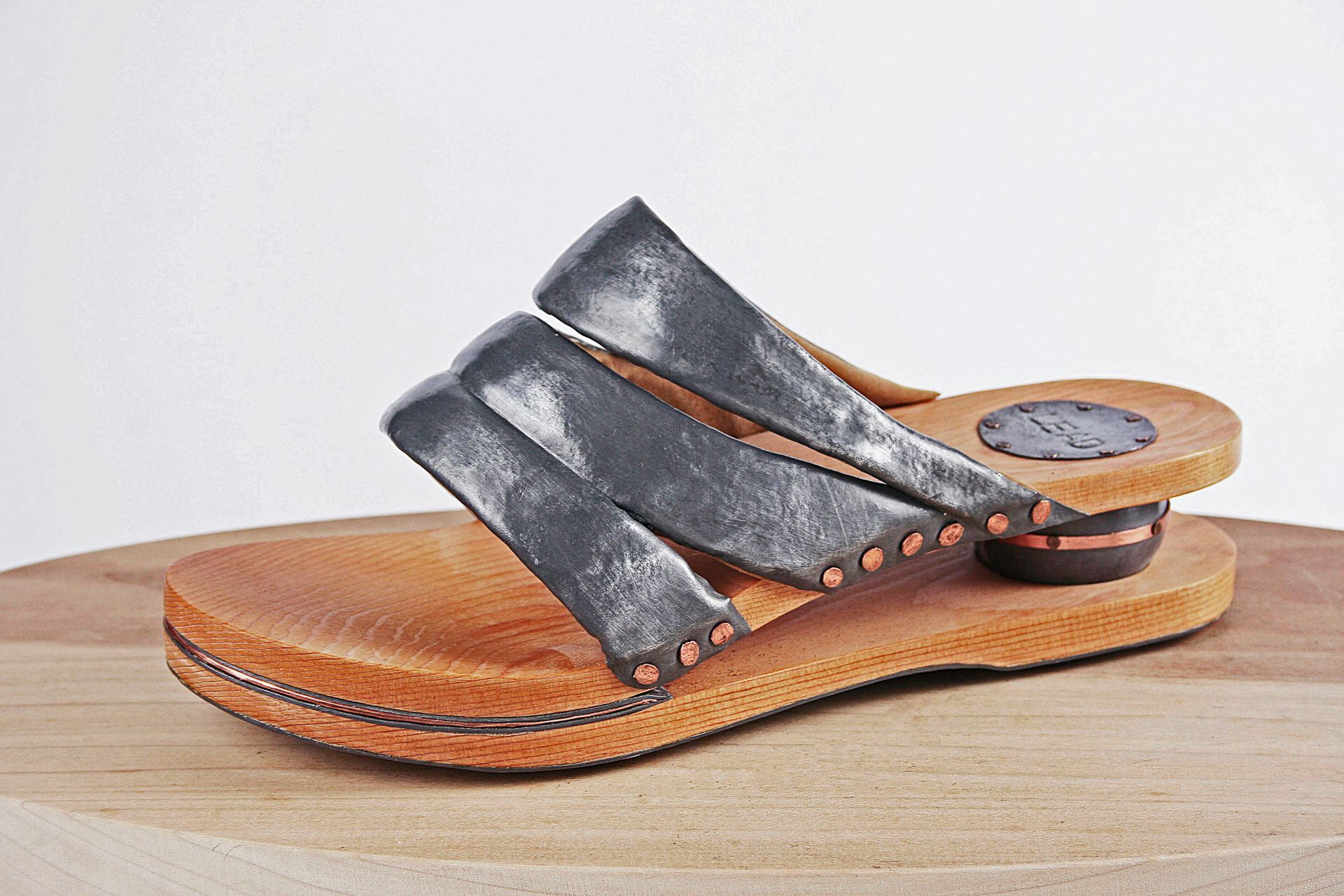 I work with lead for its malleability, its archetypal and psychological resonance, its danger, weight, beauty, its protective qualities, its recyclability, its permanence. These pieces are made using mostly traditional shoemaking techniques. Starting with a concept I create the last (form on which the shoe is made) from plaster, draft the upper pattern in paper, then cut and often sew the parts by hand. The soles are cut and shaped from lead and/or wood.